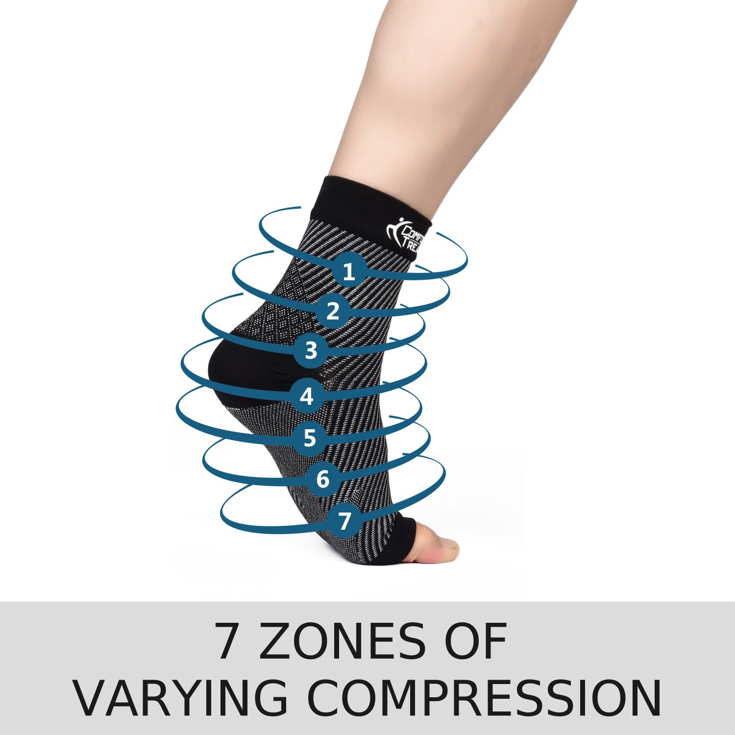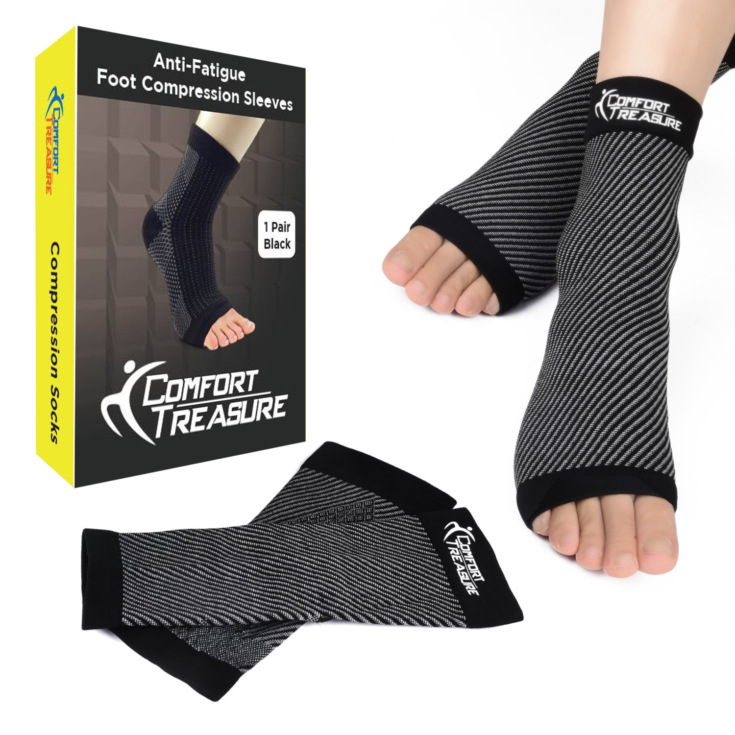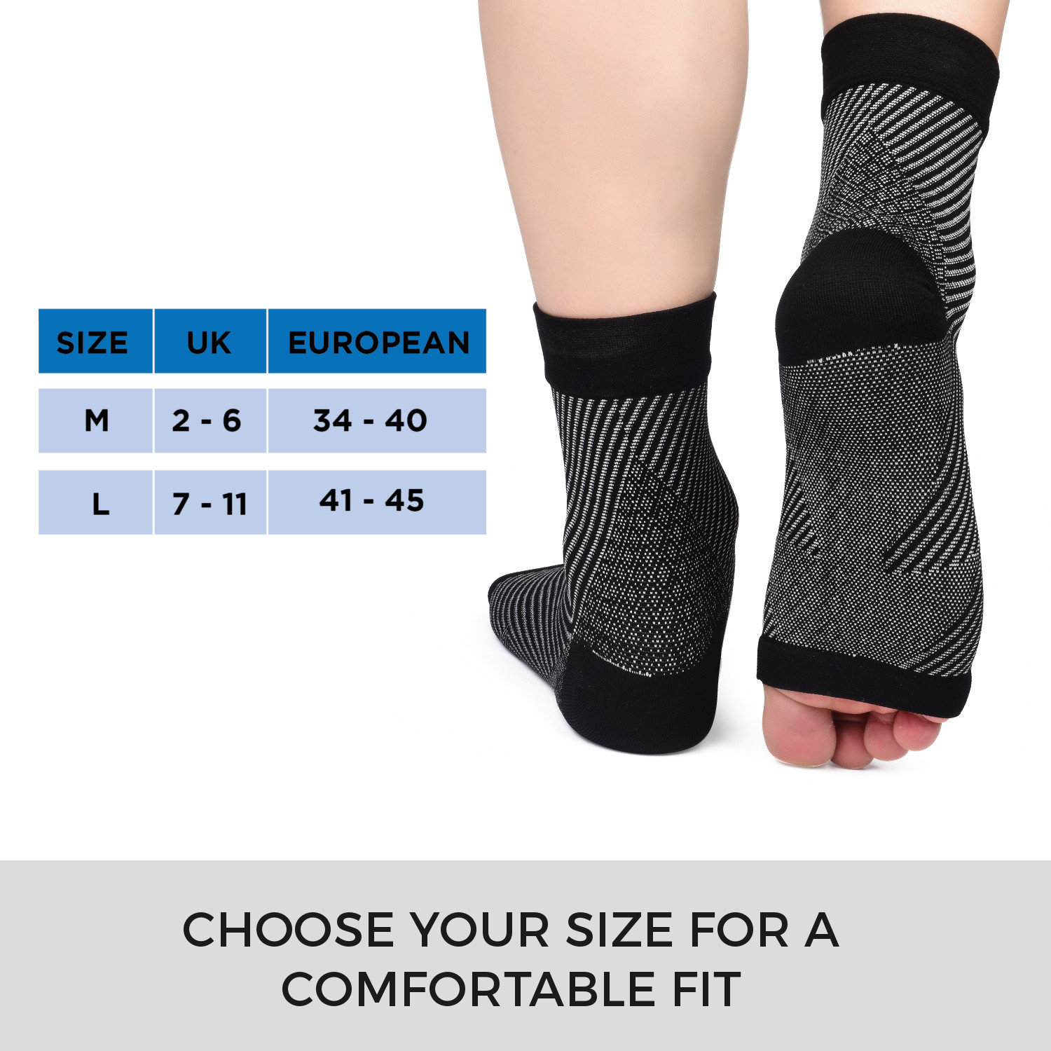 There are many products that seek to relieve the very painful condition of plantar fasciitis. The truth is, the remedy could be different for each person. If your plantar fasciitis has not got to the point of surgery, you could find that a reasonably cheap solution is to use compression socks. The compression from a plantar fasciitis sleeve can help to decrease pain and keep the situation from worsening. Along with appropriate stretching exercises you could see an improvement after wearing these compression socks.Benefits of Plantar Fasciitis Compression SleevesCompression socks are often used to reduce swelling and inflammation. Using compression sleeves helps to give all over support of the foot, and reduce arch pain that is a result of swollen feet.The benefits of compression socks may include:Better circulationDecreased arch painReduced swellingLess foot fatigueImproved heel supportDo I wear plantar fasciitis socks in addition to my normal socks?You can wear plantar fasciitis socks with your normal socks, or without, although, they are often a ‘toeless’ variety, so you will have to take that into consideration. As long as it feels comfortable, you can wear them with shoe inserts too.Less expensive than many other treatmentsWhilst Plantar fasciitis socks are certainly more expensive than a normal pair of socks, compared to a £80 pair of plantar fasciitis shoe inserts, you might find the price to be pretty reasonable. Are plantar fasciitis sleeves a good alternative to insoles?No, you’re not going to get the same support from a plantar fasciitis sock as you do a shoe insert. At the same time, shoe inserts may only provide a short term benefit for plantar fasciitis.